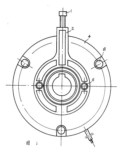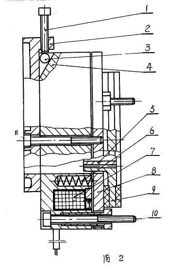参照图1,安装方法很简单,只要将动力设备的传动轴穿套在齿轮套5内,并用螺栓10将整个制动器固定于动力设备的外壳上即可。在线包7失电的制动状态下解除制动有两种方法可选择:其一是向下拧动调节螺钉1实现硬释放解除制动,其二是直接向左扳动调节螺钉1或向左拉动释放板2实现软释放解除制动。