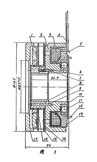 参照图1,齿轮套8,内孔拉成矩形花键。在其外圆上铣有渐开线齿,在其端面上均布了三个销孔,用销子9与磁轭铁芯2销紧。另外在其端面上还均布了三个销孔,用螺栓7与磁轭铁芯2紧固,具有同样齿形的内摩擦片14、带有隔磁套的磁铁1与齿轮套的渐开线齿啮合。内摩擦14、弹簧圈16、外摩擦片15、衔铁1,均平行放置在磁轭铁芯2的端面上,放置磁轭端面上的第一片摩擦片是内摩擦片14,接着放弹簧圈16、外摩擦片15,然后再放内摩擦片14,如此类推,但最后靠近衔铁1端面的摩擦片应是内摩擦片14,然后放置衔铁1、并用钢丝卡圈卡在齿轮套8上。将外摩擦片15的外圆上等分均布的六个槽与联结17的六个爪相啮合。本电磁离合器内摩擦片14为六片,外摩擦片15为五片,弹簧圈16为5片。