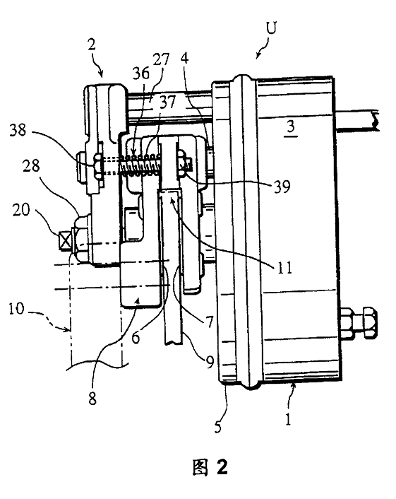 特别是,这里有一个优点,即如图2所示,当弹性元件36和调整元件37通过把螺栓38插入到压缩的螺旋弹簧来紧密地结合一起时,可以获得结构简化和成本降低。而且,尽管U形单元在浮动状态可能倾向重的电磁部分1一侧,并且制动衬片部分16可能不均匀地解除制动体9如制动盘(滑动于其上),因为电磁部分1的重量与板体2相比很重,上述的弹性元件35创造性地把板体2推向使板体2与固定支架8分开的方向而保持U形单元的平衡。