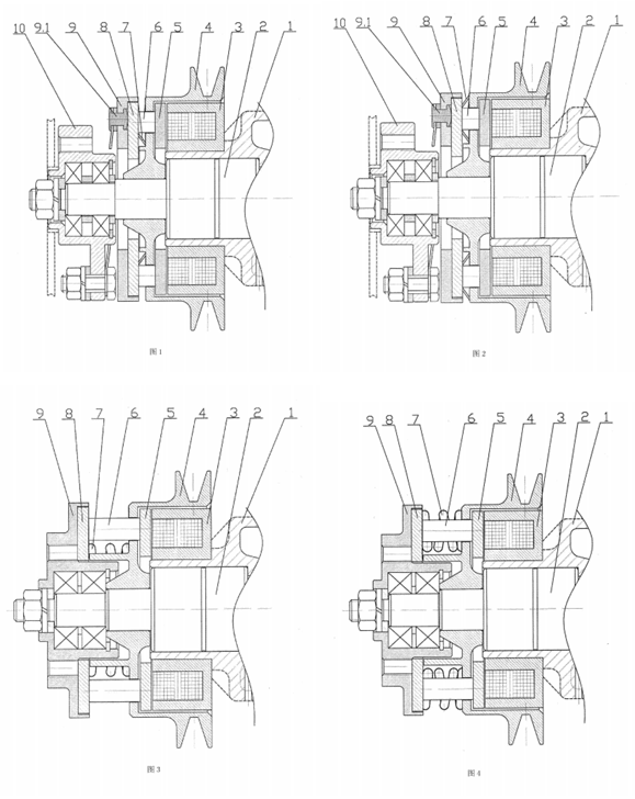 图1所示的常开式电磁风扇离合器是内燃机冷却水泵同轴配套装置,它包括泵体1内置的泵轴2,泵体1的外伸端外壁套装电磁铁3,在泵2悬臂端依次定位安装皮带轮4和风扇座10。皮带轮4为内置空腔的结构件,设在左侧的轮幅联动泵轴2,右侧设有轴向敞口腔体用于容纳电磁铁3。 本实例为福田轻配套件,因体积相对较小,皮带轮4左侧轮幅端面同一圆周均布3只通孔,通中安置间隙配合的柱销6,在轮幅端面设有平行相间的主动盘5,轮幅外端面设有由弹簧7平行相间的摩擦盘8,柱销6两端分别固定连接摩擦盘8和主动盘5。本实例弹簧7是蝶形弹簧,结构中利用蝶形弹簧的向变形来改变摩擦盘8与从动盘9的贴合或分离。摩擦盘8与从动盘9端面相靠成为可离合的一对摩擦面,此结构的摩擦面实为一种常开式离合器,可控制从动盘9相连风扇座10的作状态.燃机使用初期,即内燃机处于冷机状态下,操作人员启动点火开关,此时电磁铁3通电,被吸合的主动盘5通过销6联动摩擦盘8,使弹簧7轴向受压,右移的摩擦盘8脱离从动盘9,从而使风扇座10失去动力源而静止。持续运行的内燃机促成冷却水温升高,当冷却水温达到设定温度时,内燃机配置的温控传感器控制电磁铁3断电,弹簧7 一旦失去约束即恢复至常态,轴向伸展的弹簧7推动摩擦盘8左移与从动盘9贴合,从动盘9通过弹性片9. 1联动风扇座10,使得风扇座10随皮带轮4一起旋转,以达到强制冷却的的。